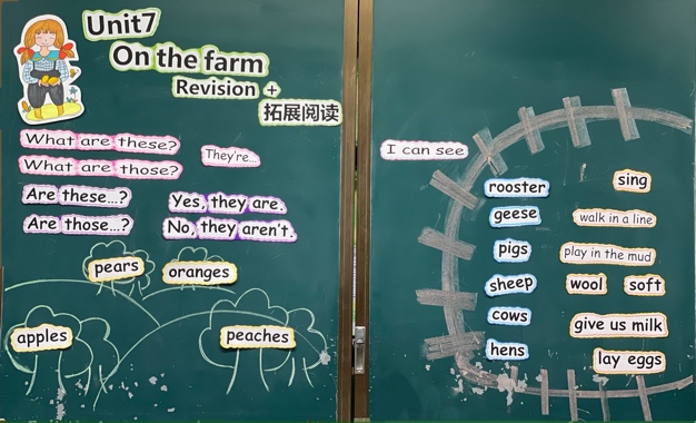 本单元是以农场为背景教授句型Welcome to … What are these/those? They’re… Are these/those…?Yes./No.以及单词farm, pigs, chickens, ducks, cows, apples, oranges和pears。再通过绘本让学生在加强对单词、句型的巩固和拓展的同时了解农场的动物们给我们带来的价值。