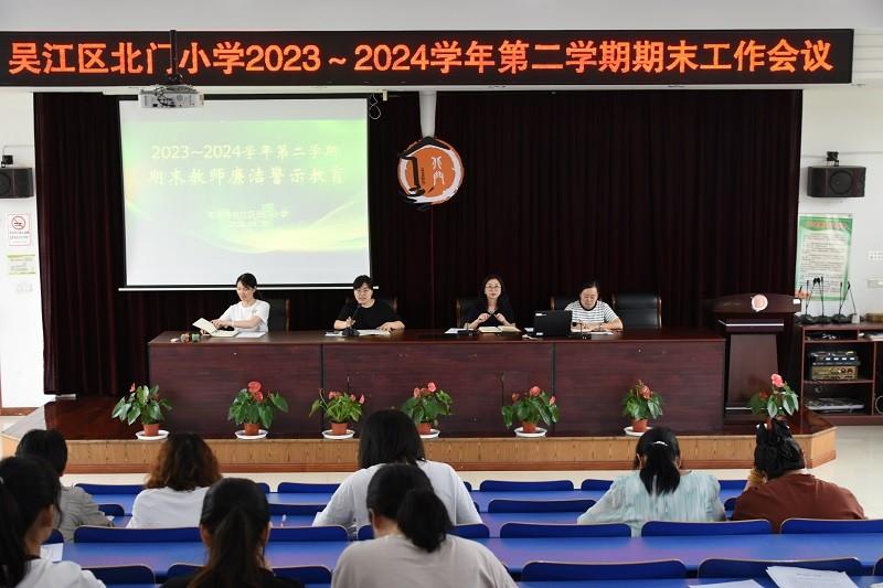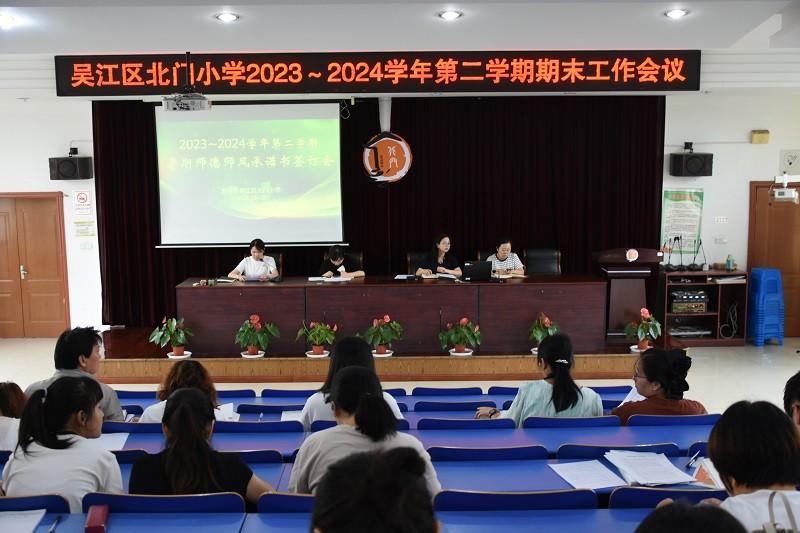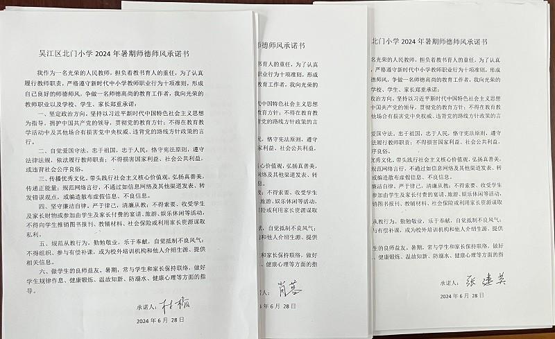活动由校长肖晶主持。肖校长带领全体教师对照教师职业行为十项准则,向全体教师强调网络言行、社会活动和廉洁自律等方面的禁止行为,坚决杜绝“校外培训机构兼职取酬”“顶风违纪有偿补课”“违规收受礼品礼金”等问题,切实让教师们自觉维护光辉形象、恪守职业底线、严禁行为红线。活动最后,全体教师在《吴江区北门小学2024年暑期师德师风承诺书》上郑重签下自己的名字。