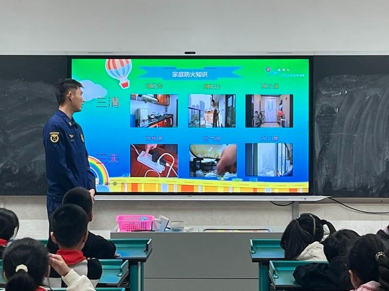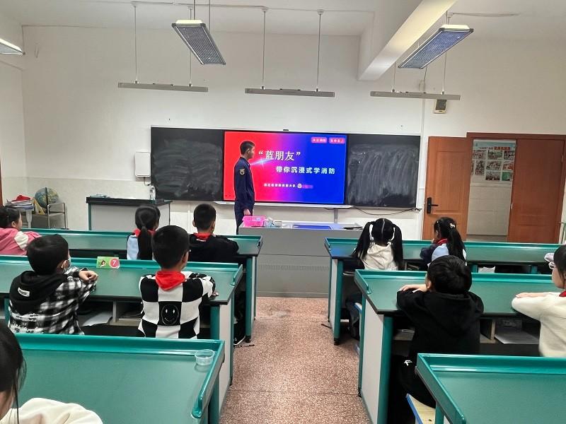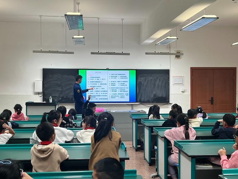 为增强学生消防安全意识,掌握应急避险技能,11月14日,北门小学邀请体育路消防救援站的消防员,为四(2)班学生带来了一场主题为“‘蓝朋友’带你沉浸式学消防”的安全知识讲座。